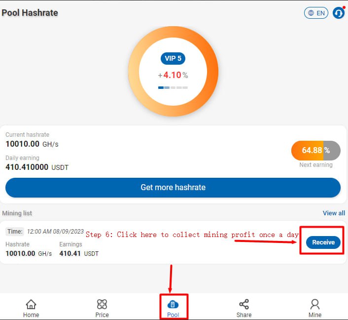 7: Click on the mining pool and collect your mining profit once a day