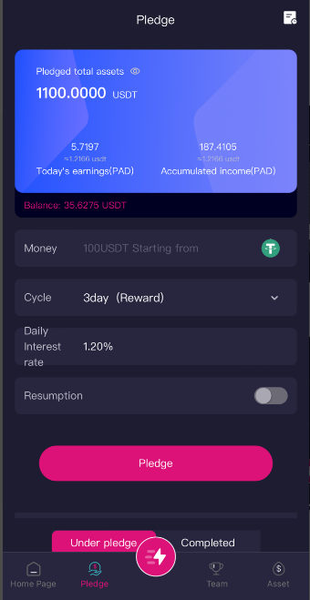 Pagadi will give us 100 USDT to deposit stakes for interest, but only 3 days deposit with 1.2% interest rate; to earn PAD. For the recipients of the free airdrop, the money has not been withdrawn yet, but only waiting for the mainnet to be converted.