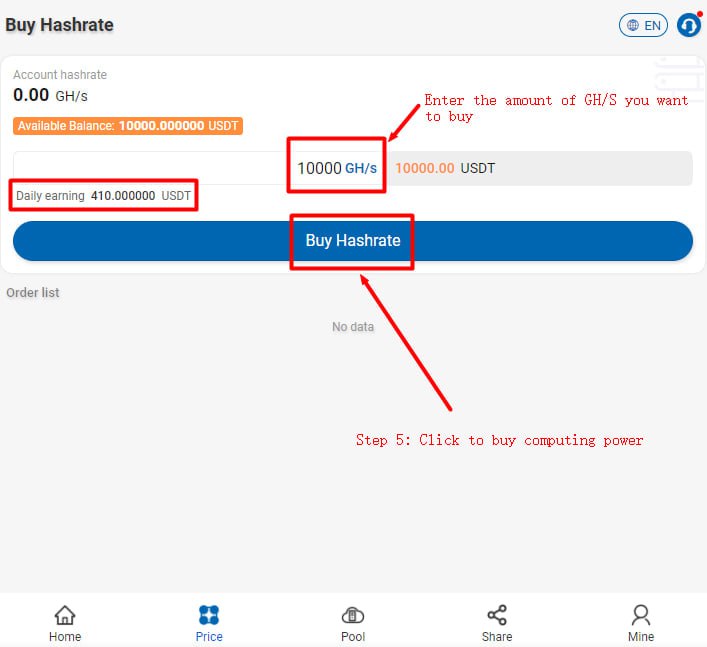 Price - > Enter the amount of usdt - Click Buy Hashrate