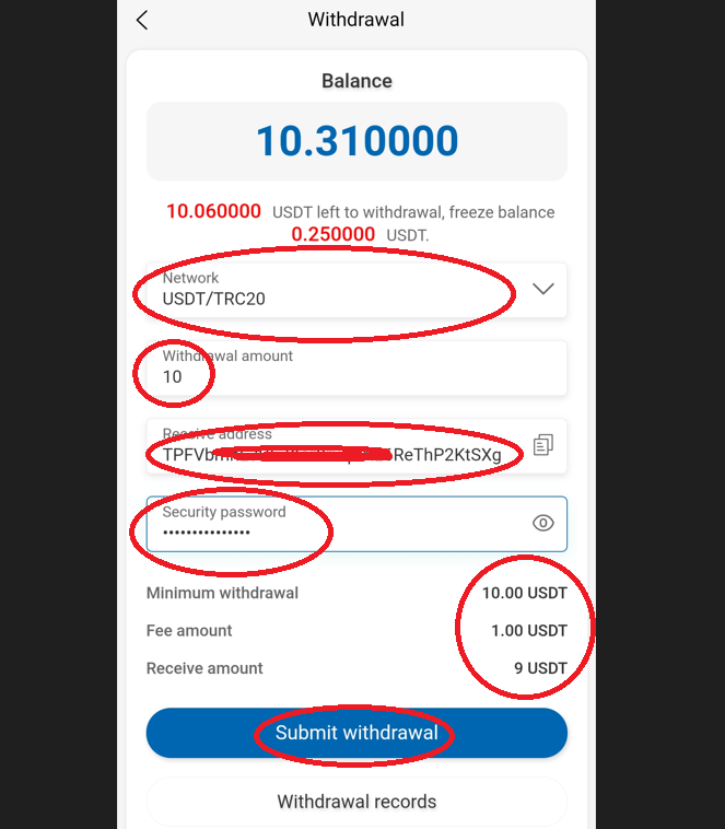 9: Select cash withdrawal on this platform, enter your wallet receiving address, and the cash will be automatically credited within 5 minutes after successful withdrawal