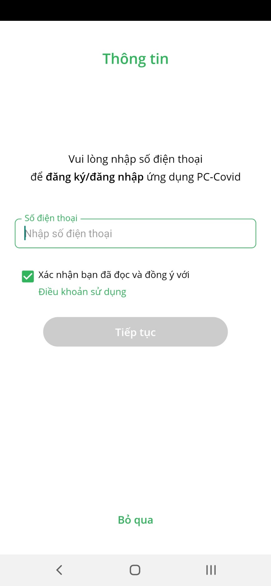 - NHẬP SỐ ĐIỆN THOẠI (NÊN DÙNG SỐ ĐIỆN THOẠI ĐÃ ĐĂNG KÝ SỔ SỨC KHỎE ĐIỆN TỬ; ĐĂNG KÝ CÁC ỨNG DỤNG PHÒNG CHỐNG COVID KHÁC) SAU ĐÓ NHẤN TIẾP TỤC ĐỂ LẤY MÃ OTP VỀ ĐIỆN THOẠI