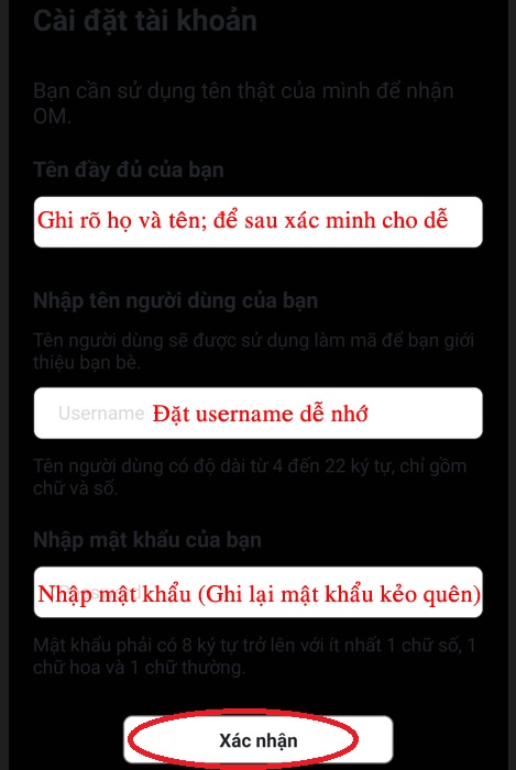 Lưu ý: Mọi người đặt tên chuẩn của mình nhé, để sau xác minh danh tính cho dễ