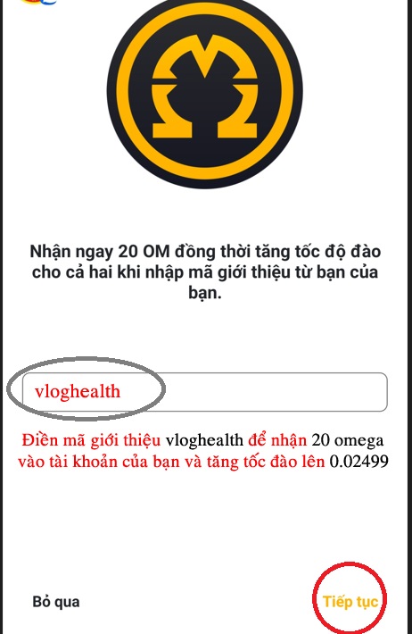 - Điền mã giới thiệu vloghealth để được nhận 16 Omega về tài khoản và tăng tốc độ khai thác sau đó nhấn tiếp tục