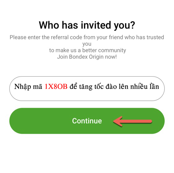 Mã giới thiệu anh em nhập 1X8OB để đào chung team 5000 anh em Bondex Origin . Sau đó, nhấn "Continue" để tiếp tục.