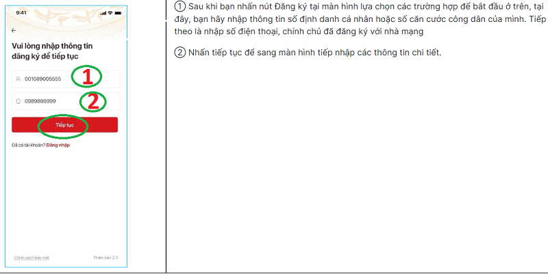 Sau khi bạn nhấn nút Đăng ký tại màn hình lựa chọn các trường hợp để bắt đầu ở trên, tại đây, bạn hãy nhập thông tin số định danh cá nhân hoặc số căn cước công dân của mình. Tiếp theo là nhập số điện thoại, chính chủ đã đăng ký với nhà mạng