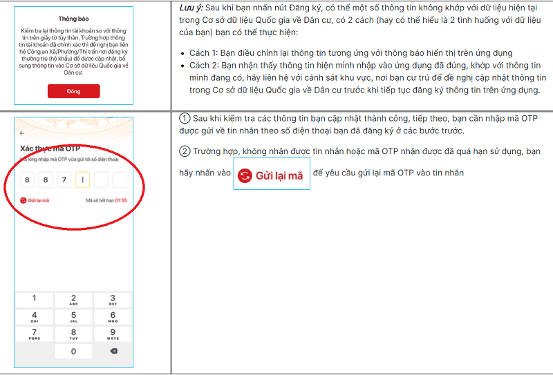 Lưu ý: Sau khi bạn nhấn nút Đăng ký, có thể một số thông tin không khớp với dữ liệu hiện tại trong Cơ sở dữ liệu Quốc gia về Dân cư, có 2 cách (hay có thể hiểu là 2 tình huống với dữ liệu của bạn) bạn có thể thực hiện: