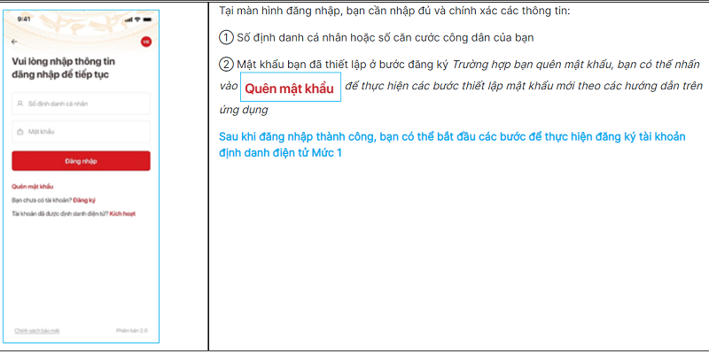 Mật khẩu bạn đã thiết lập ở bước đăng ký Trường hợp bạn quên mật khẩu, bạn có thể nhấn vào  để thực hiện các bước thiết lập mật khẩu mới theo các hướng dẫn trên ứng dụng