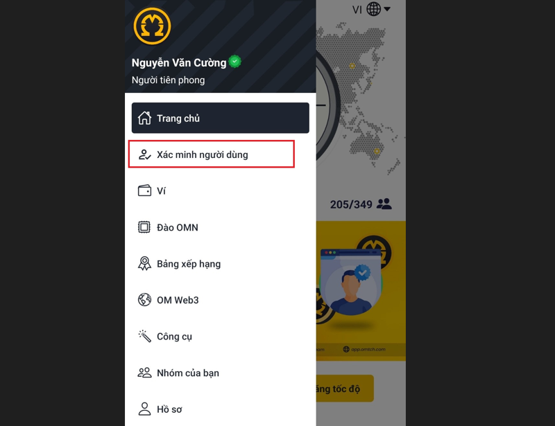 Bước 1: Mở ứng dụng OmegaNetwork, chọn menu, sau đó chọn "Xác minh người dùng".