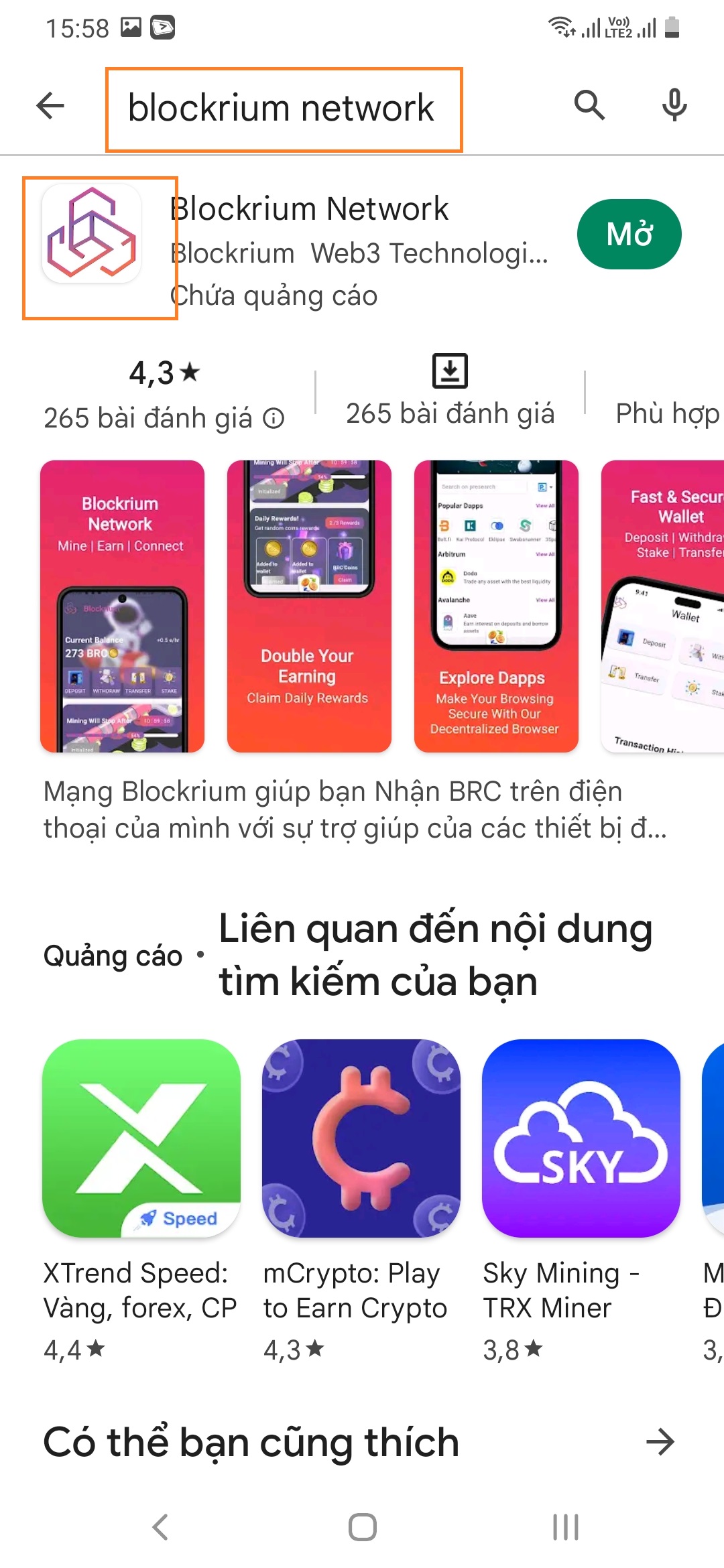 Hoặc vào Google Play gõ cụm từ khóa: "Blockrium Network" rồi tải và cài đặt