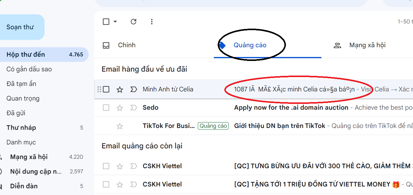 Vào email nếu không thấy mã code gửi về ở mục thư chính, mọi người có thể tìm ở mục spam hoặc quảng cáo, hoặc mạng xã hội