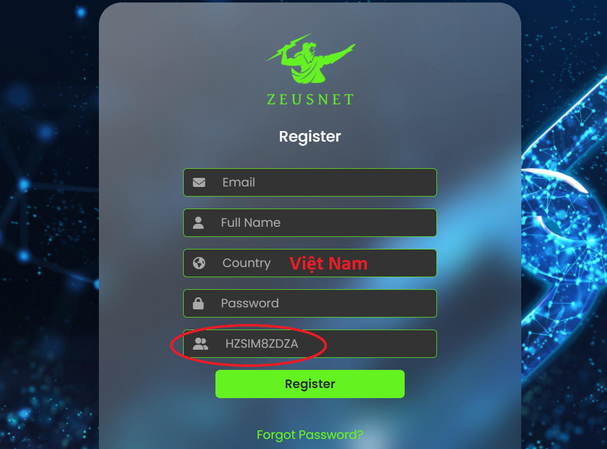 Việc đăng ký tài khoản Zeusnet khá đơn giản, chỉ cần có email và mã giới thiệu