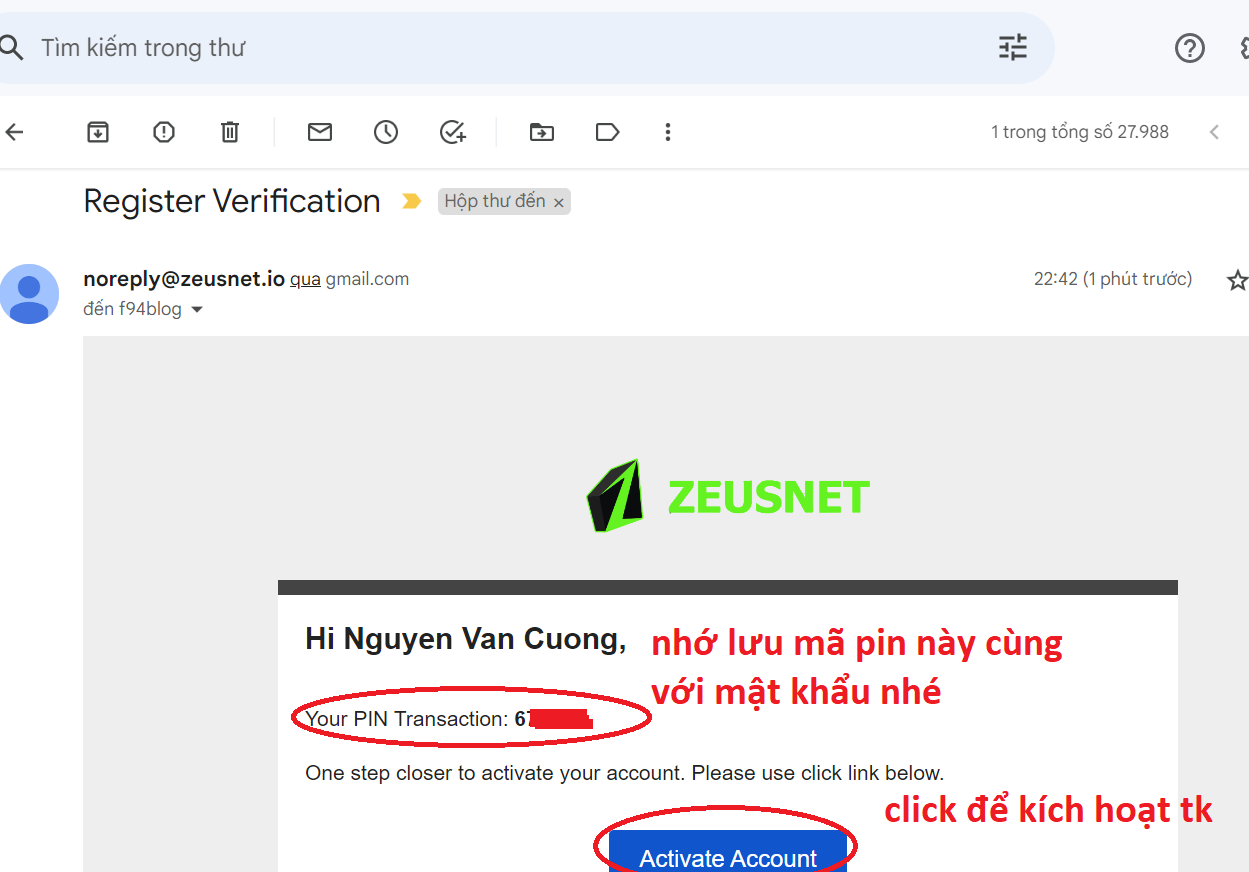 Sau đó hệ thống sẽ gửi về Email cho chúng ta một mã PIN và link kích hoạt tài khoản, mọi người vào email để lấy Pin và kích hoạt. Nếu ở hộp thư chính không có thì anh em tìm ở mục spam, quảng cáo hoặc mạng xã hội để tìm link.