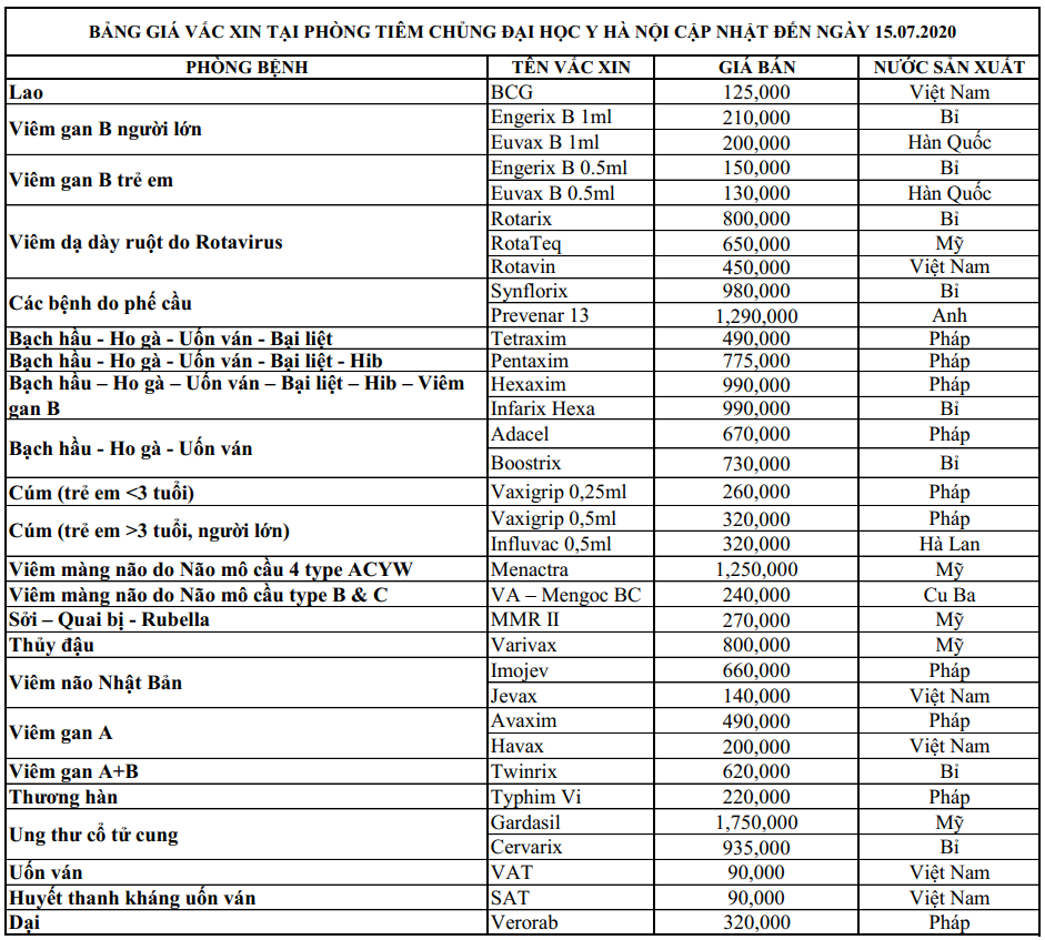 Bảng giá vacxin tại phòng tiêm chủng Bệnh viện Đại học y Hà Nội cập nhật đến ngày 15/07/2020 (Giá có thể thay đổi mà chưa kip báo trước). Tiêm vắc-xin cho con là điều vô cùng quan trọng vì điều này không chỉ giúp con bạn tránh được những căn bệnh nguy hiểm mà còn mang lại cho gia đình và xã hội nhiều lợi ích to lớn khác.