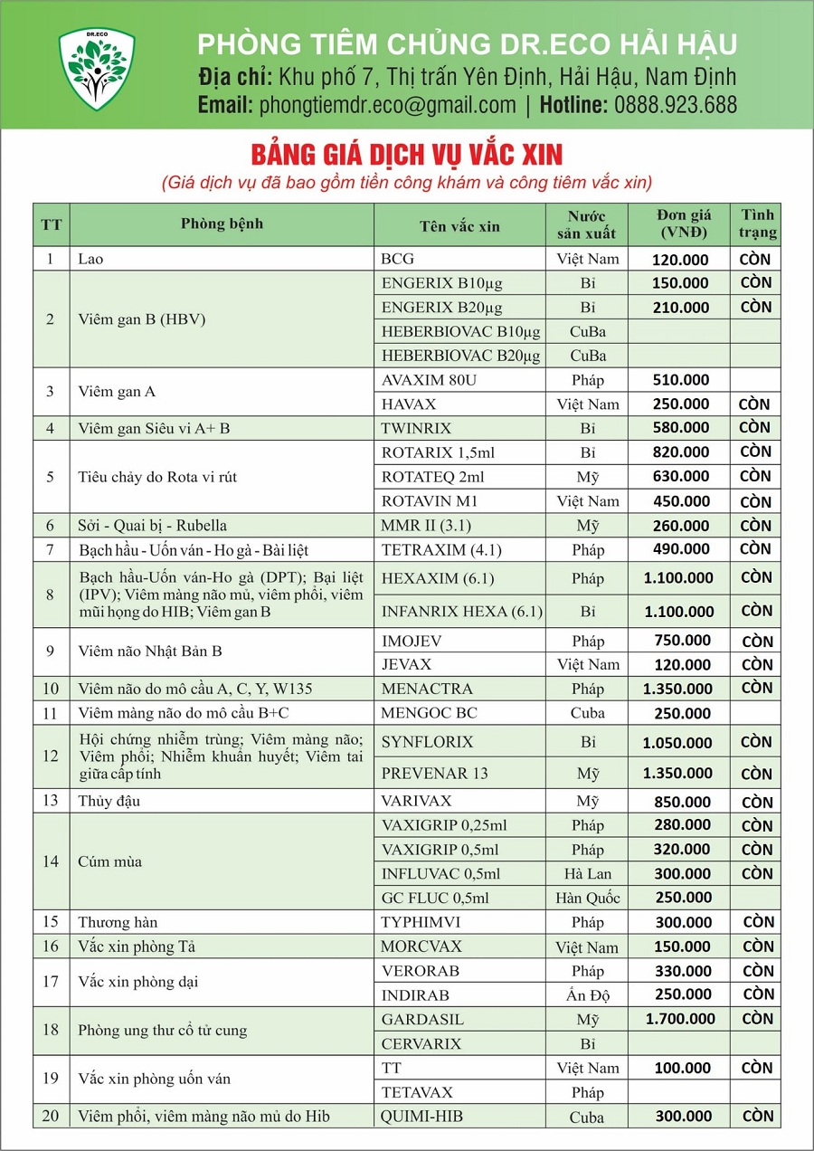 Phòng tiêm chủng DR.ECO Hải Hậu thông báo các loại vắc xin hiện có và bảng giá (loại nào có giá và ghi còn trên ảnh là hiện có sẵn).