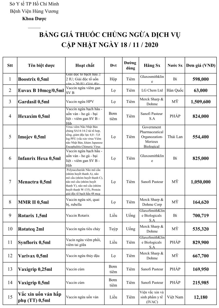Bảng giá tiêm chủng tại Bệnh viện Hùng Vương