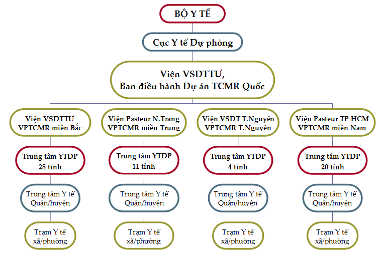 Tiêm chủng mở rộng là Dự án mục tiêu quốc gia y tế. Cấu trúc hệ thống gồm Ban Điều hành và Văn phòng Tiêm chủng mở rộng Quốc gia đặt tại Viện Vệ sinh Dịch tễ Trung ương. Có 4 văn phòng TCMR khu vực đặt tại 4 Viện Vệ sinh Dịch tễ/Pasteur của 4 khu vực miền Bắc, miền Trung, miền Nam và Tây Nguyên. Tại tuyến tỉnh có bộ phận chuyên trách TCMR nằm trong khoa Kiểm soát bệnh truyền nhiễm hoặc khoa Dịch tễ thuộc Trung tâm YTDP của 63 tỉnh/thành phố trên cả nước. Tuyến huyện có cán bộ chuyên trách TCMR nằm tại khoa Kiểm soát bệnh truyền nhiễm thuộc Trung tâm Y tế của 696 huyện trên cả nước. Tại tuyến xã, Trạm y tế xã là đầu mối chịu trách nhiệm công tác TCMR ở 11.138 xã. Tổng số nhân lực tham gia hoạt động của Dự án TCMR khoảng 5.000 người, gồm chủ yếu là cán bộ y tế và một số thành phần khác như nhân viên kỹ thuật, ngành luật, truyền thông, cung ứng dịch vụ vận tải... hoạt động ở tất cả các tuyến y tế trên cả nước.