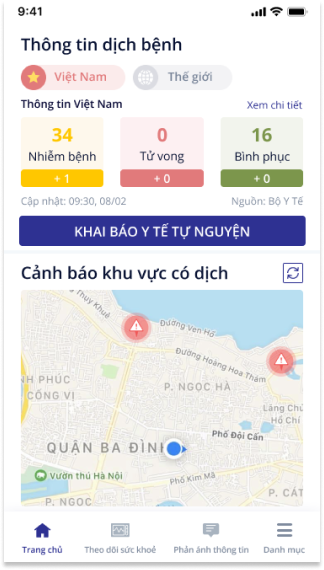 Cho phép người dân khai báo y tế phòng chống dịch, cung cấp thông tin giúp nhà quản lý nhanh chóng khoanh vùng, xác định trường hợp cần cách ly y tế hoặc cần hỗ trợ.